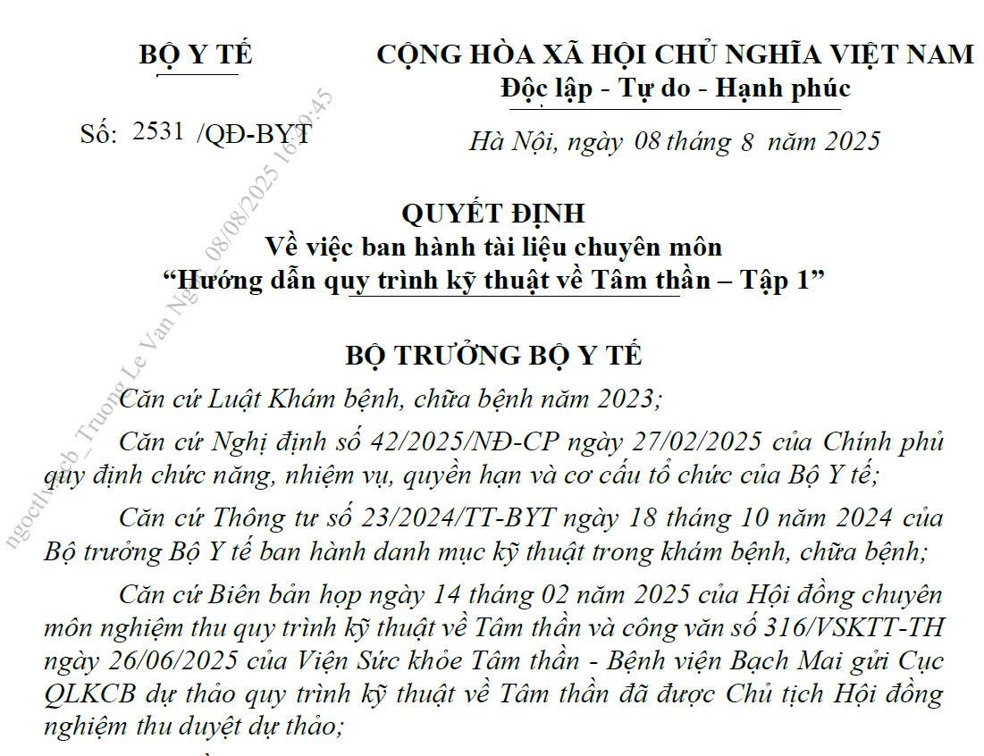 PCC fC – NCKH tỉnh thức, Bộ Y tế ngày 8/8/2025, vừa ra Quyết định 2531/QĐ-BYT chính thức ban hành tài liệu chuyên môn “Hướng dẫn quy trình kỹ thuật về Tâm thần – Tập 1” gồm 69 quy trình kỹ thuật, đánh dấu một bước tiến quan trọng trong việc chuẩn hóa chẩn đoán, điều trị và chăm sóc sức khỏe tâm thần tại Việt Nam.