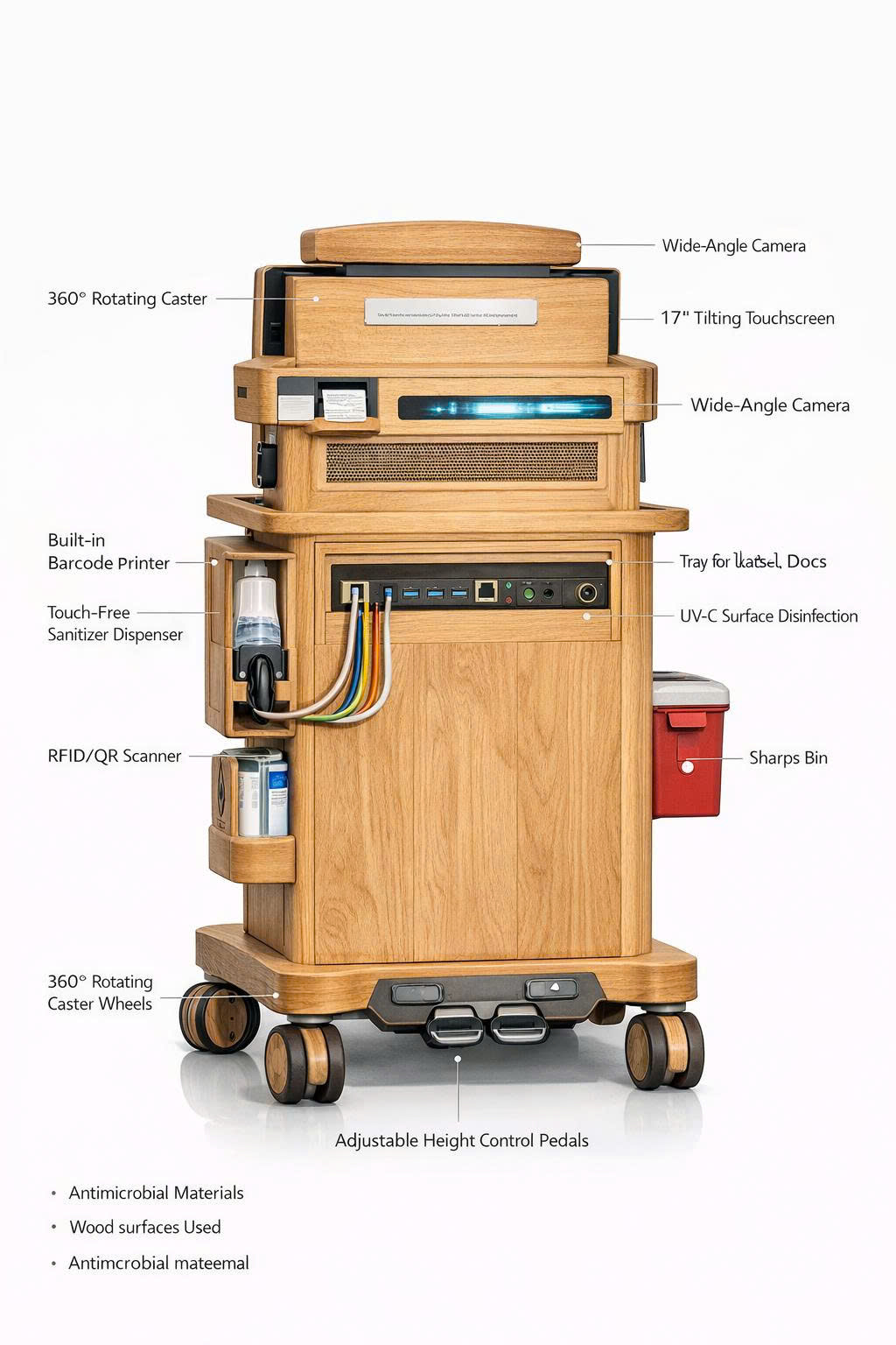 1. Phần cứng thông minh: Xe đi buồng tích hợp màn hình y tế, camera, QR/RFID, ngăn thuốc – vật tư chuẩn hóa, phù hợp môi trường ICU.