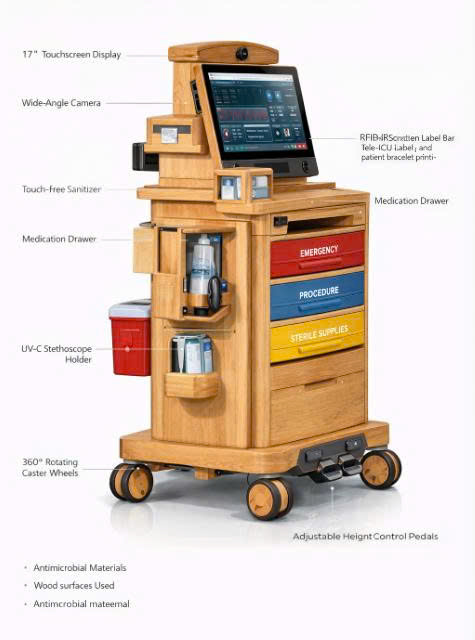 Xe ICU-Go có thiết kế gọn, chắc chắn, cơ động, phù hợp di chuyển giữa các giường bệnh ICU và hành lang hẹp. Kết cấu module hóa cho phép tùy biến theo từng khoa và mục đích sử dụng. Khung xe vững chắc, bo tròn an toàn. Bánh xe xoay 360°, có khóa cố định. Chiều cao và vị trí màn hình tối ưu công thái học cho bác sĩ, điều dưỡng. Dễ vệ sinh, phù hợp môi trường kiểm soát nhiễm khuẩn.