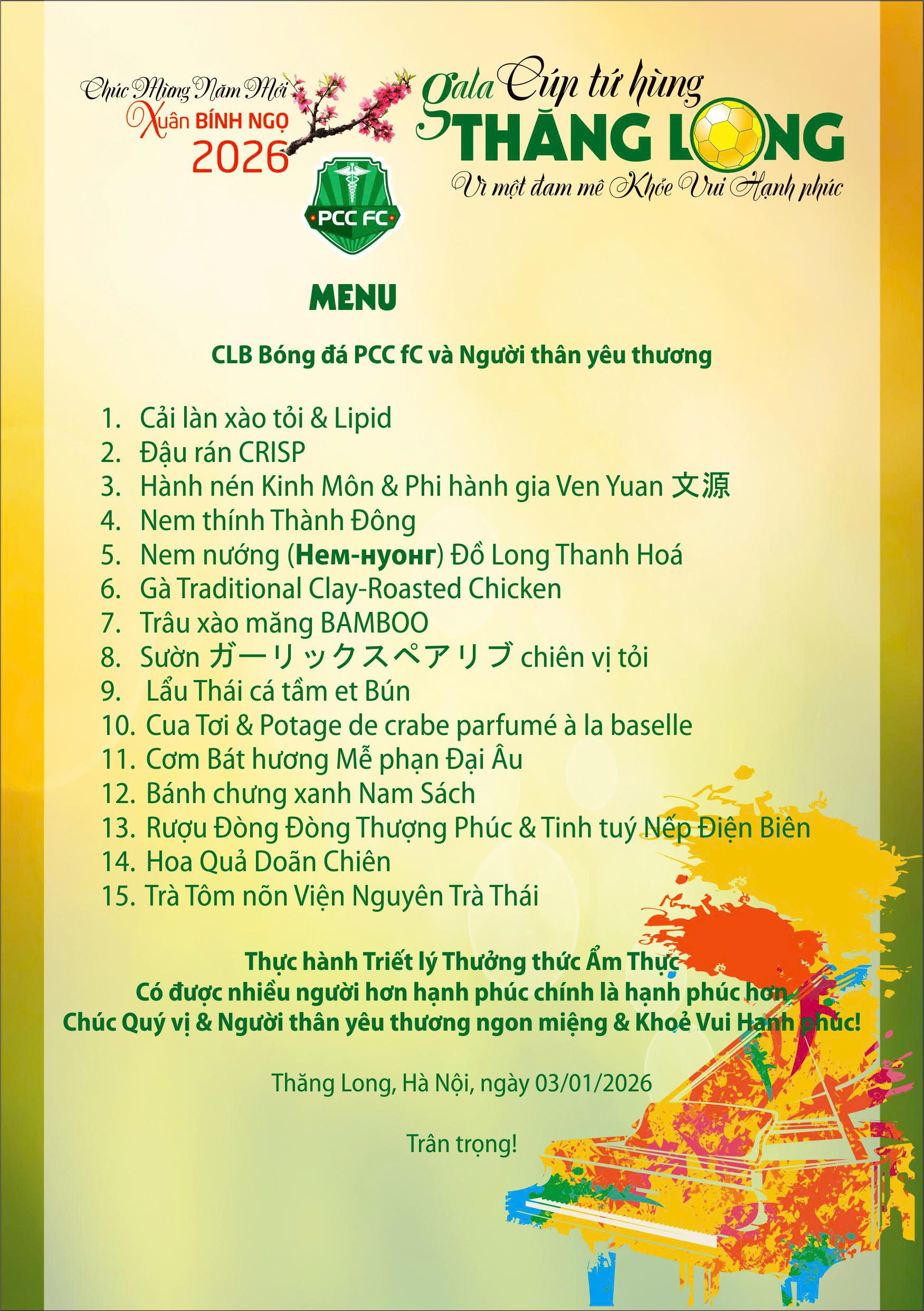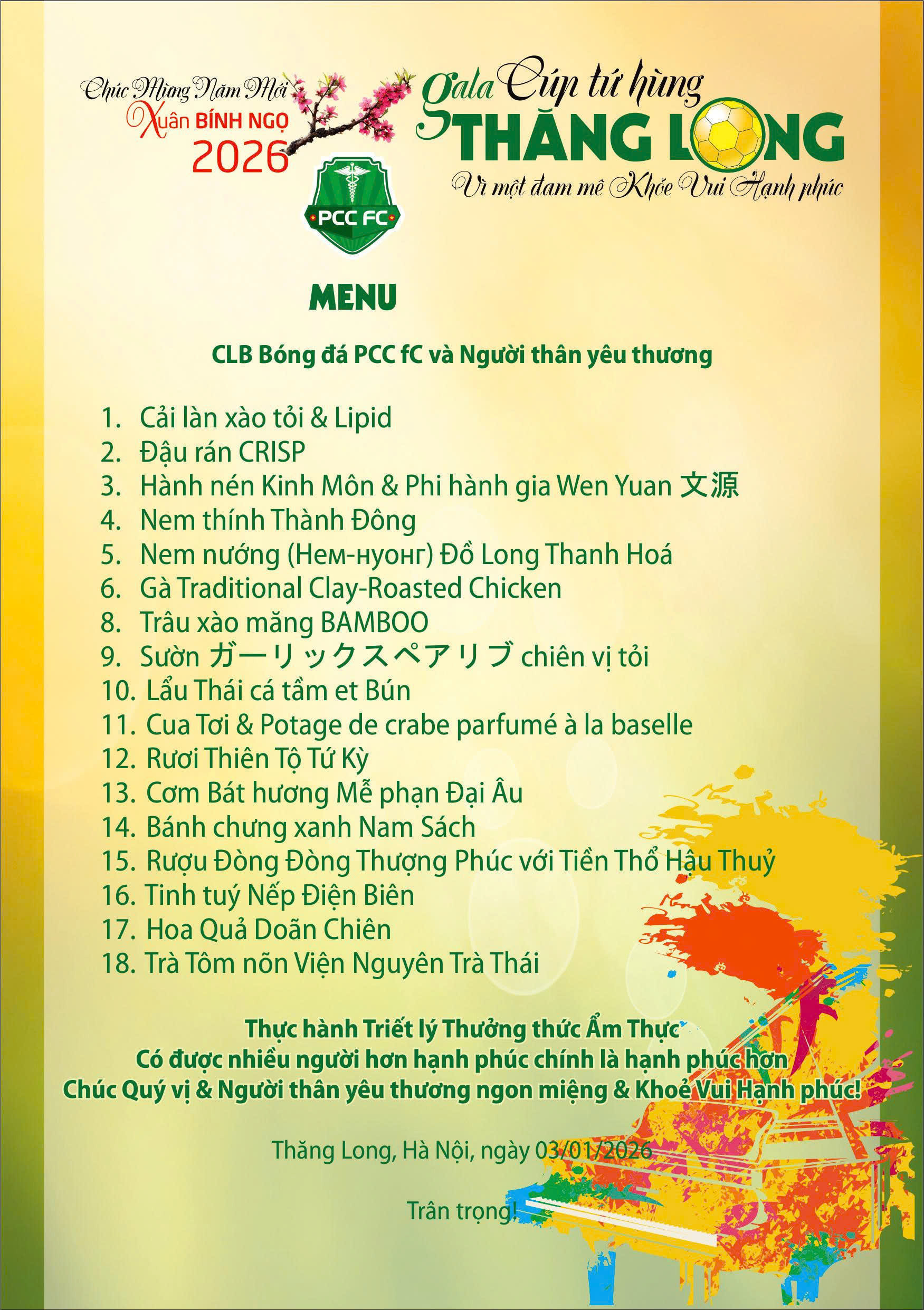 PCC fC – Thăng Long, Hà Nội, ngày 3/1/2026, trong dòng chảy rộn ràng của Gala Cúp Tứ Hùng Thăng Long 2026, thực đơn không đơn thuần là danh sách các món ăn, mà là một thông điệp được gửi gắm bằng ẩm thực. Mỗi món được lựa chọn và sắp đặt như một nốt nhạc trong bản hòa âm của khoa học, dinh dưỡng, văn hoá và tinh thần thể thao, hướng tới giá trị cốt lõi mà PCC fC theo đuổi: Khỏe Vui Hạnh phúc. Bữa tiệc vì thế không chỉ nuôi dưỡng cơ thể sau những giờ vận động và gắn kết, mà còn nuôi dưỡng cảm xúc, ký ức và sự thuộc về của cộng đồng. Từ nền tảng đó, việc nhìn lại và phân tích thực đơn này chính là cách để thấy rõ hơn một triết lý sống: ăn đúng nhịp sinh học, ăn trong văn hoá, và ăn cùng nhau để hạnh phúc được lan tỏa bền lâu.