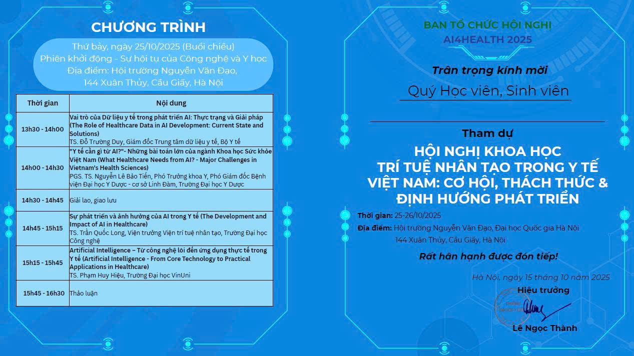 Full Giấy mời để có thông tin chi tiết xin load tại đây:Thư mời Hội nghị AI4Health2025_gửi học viên, sinh viên