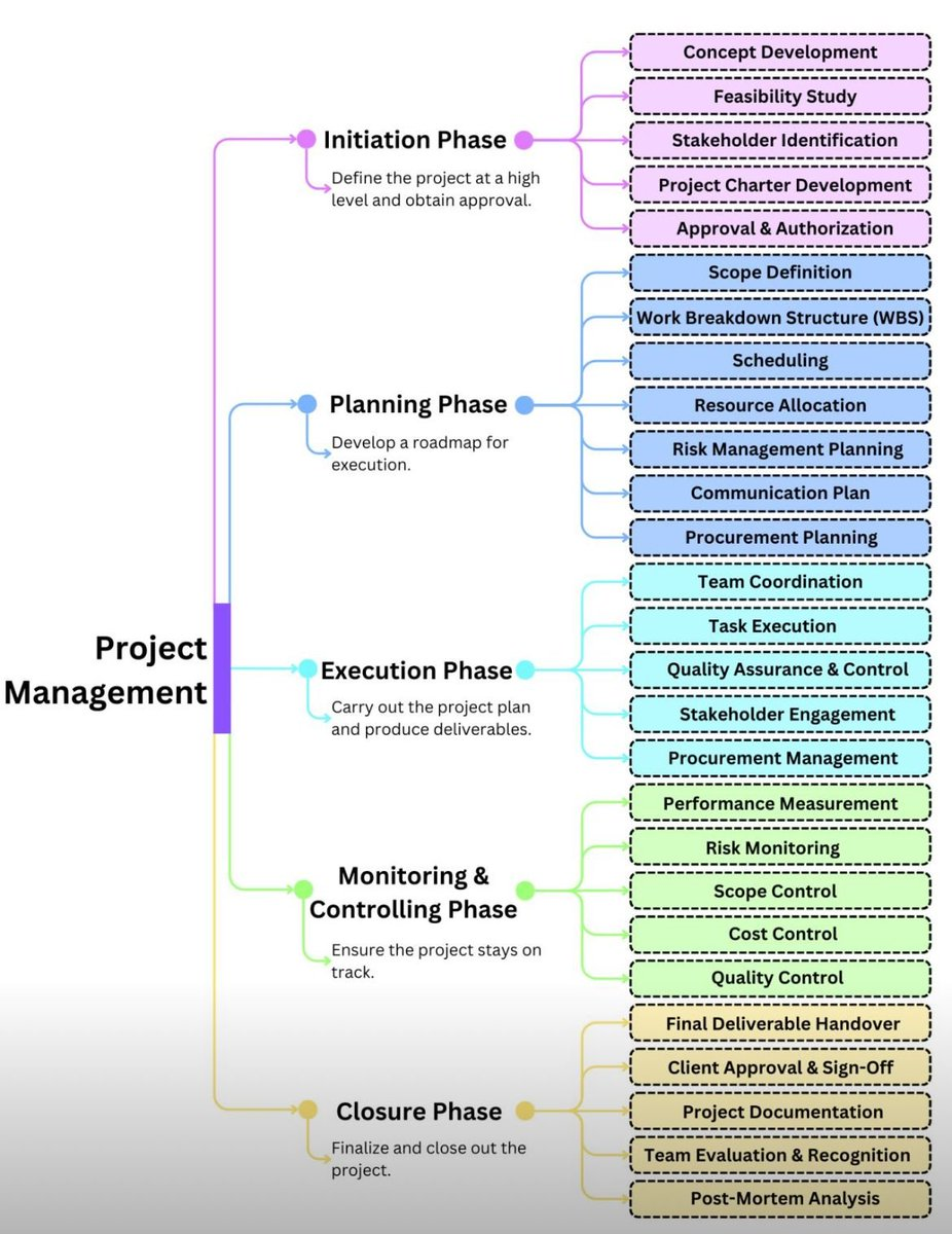 Dưới đây là sơ đồ 5 giai đoạn của quản lý dự án (Project Management Life Cycle) – một khung kinh điển trong quản lý dự án theo chuẩn PMI (Viện Quản lý Dự án của Hoa Kỳ, 1969). Dưới đây là bản tóm tắt chi tiết và dễ hiểu cho từng giai đoạn cùng các đầu việc cụ thể tương ứng trong hình: