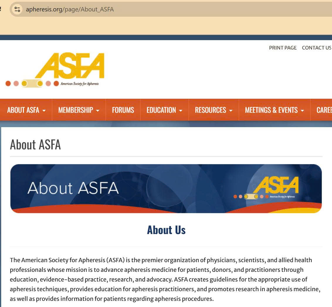 Ghi chú (*): Hội thay huyết tương Hoa Kỳ (ASFA – American Society for Apheresis) là tổ chức quốc tế uy tín được hình thành từ sự hợp nhất giữa hội bác sĩ – nhà khoa học và hội điều dưỡng – kỹ thuật viên apheresis, với sứ mệnh phát triển y học lọc tách máu cho bệnh nhân, người hiến và nhân viên y tế thông qua giáo dục, thực hành dựa trên bằng chứng, nghiên cứu và vận động chính sách. ASFA bao quát cả lĩnh vực gạn tách điều trị (TPE, DFPP, IA, RBC exchange, photopheresis…) và gạn tách từ người hiến, nổi bật với Hướng dẫn ASFA được cập nhật định kỳ (phiên bản mới nhất 2023 – 9th edition), phân loại chỉ định theo mức độ bằng chứng (Category I–IV), được coi là chuẩn mực toàn cầu cho chỉ định và thực hành. Hội tổ chức hội nghị thường niên, các khóa Apheresis Academy, webinar đào tạo, đồng thời là mạng lưới quy tụ bác sĩ, điều dưỡng, kỹ thuật viên, nhà khoa học và đối tác công nghiệp, có ảnh hưởng lớn tới chính sách y tế, hướng dẫn quốc gia và y văn quốc tế.