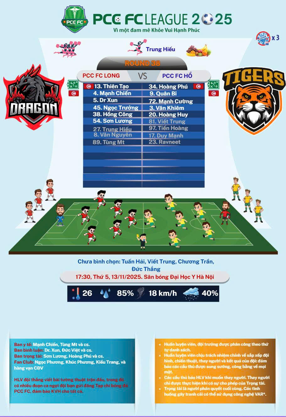 PCC fC League 2025 – Thăng Long, ngày 13/11/2025, Vòng 39 PCC fC League 2025 chứng kiến cuộc đối đầu hấp dẫn giữa PCC fC Long và PCC fC Hổ, nơi cả hai đội đều trình diễn lối chơi tấn công mãn nhãn trong bầu không khí rực lửa của hơn 2 vạn cổ động viên. Đặc biệt, hôm nay đội Hổ có sự có mặt của ngoại binh, sinh viên Y khoa Tuteja Rav từ Australia.