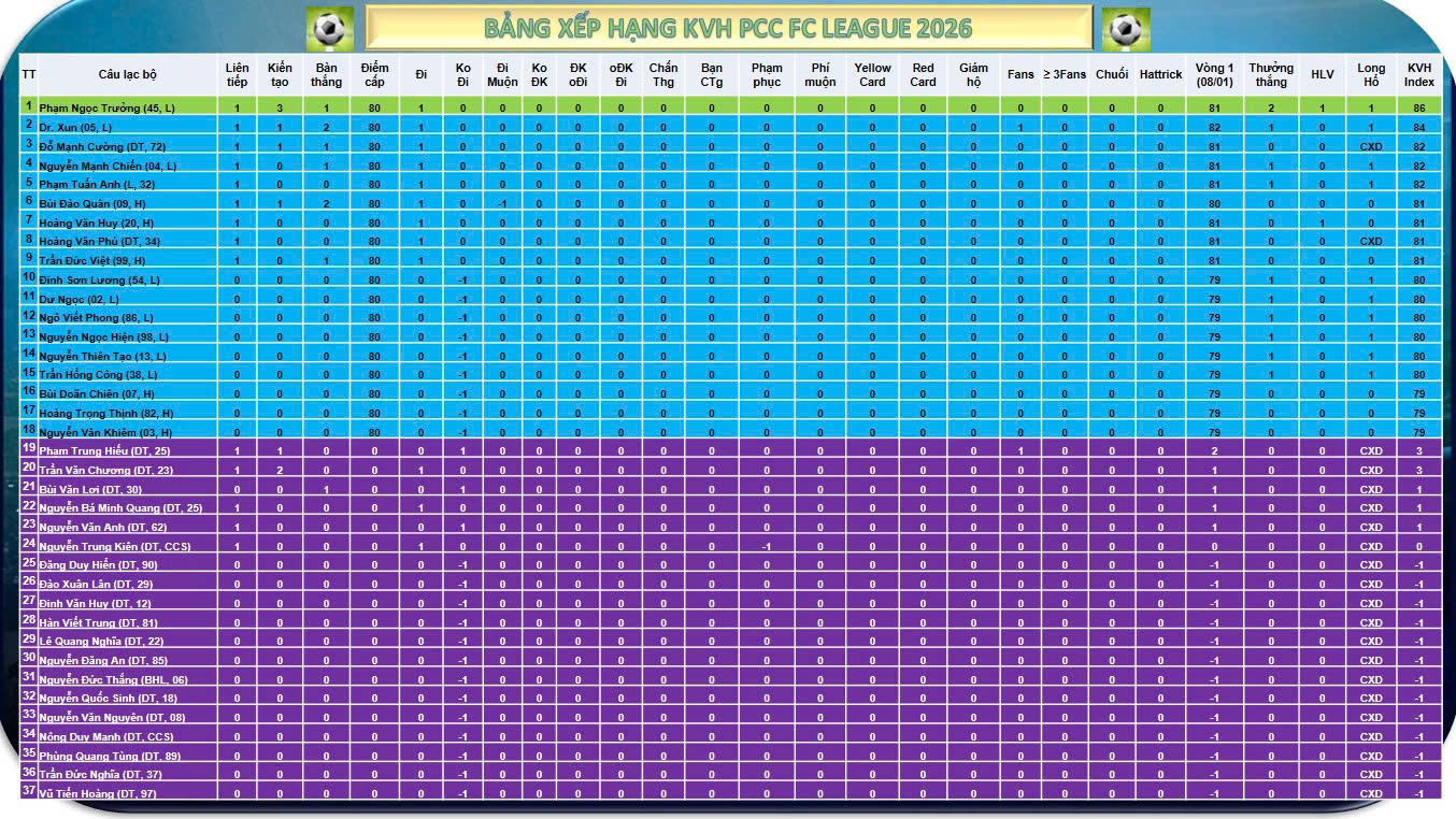HLV Long Ngọc Trưởng đã cùng PCC fC giành chiến thắng thuyết phục trước Hổ PCC fC, lần đầu tiên trong giải đấu anh được cộng 6 điểm KVH (1 điểm ra sân, 2 điểm HLV chỉ đạo thắng, 3 điểm cho 3 pha kiến tạo theo Luật mới của PCC fC) đưa anh trở thành người đầu tiên đạt màu xanh nõn chuối ngay sau 1 vòng đấu Khai Mào
