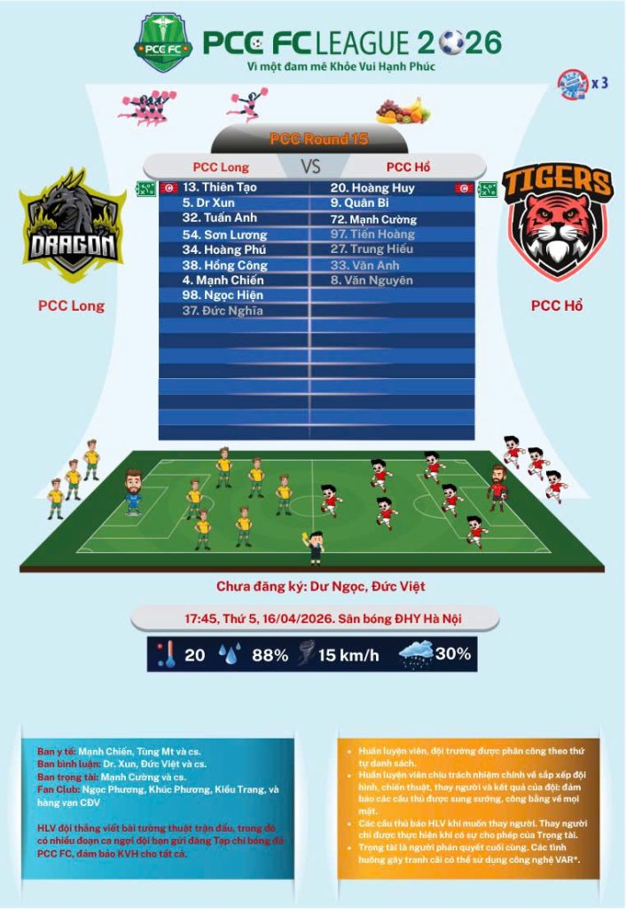 PCC fC League 2026 Vòng 15 – Thăng Long, 16/4/2026, PCC fC Hổ giành chiến thắng 6–4 trước PCC fC Long trong trận đấu nhiều bàn thắng. Hoàng Huy lập hat-trick (20’, 22’, 40’), các bàn còn lại của Hổ do Tiến Hoàng (75’), Văn Anh (89’) và Ngọc Tiến (92’) ghi. PCC fC Long ghi 4 bàn nhờ cú đúp của Văn Bằng (59’, 61’), cùng các pha lập công của Ngọc Dương (65’, kiến tạo Văn Bằng) và Mạnh Chiến (68’, kiến tạo Hồng Công).
