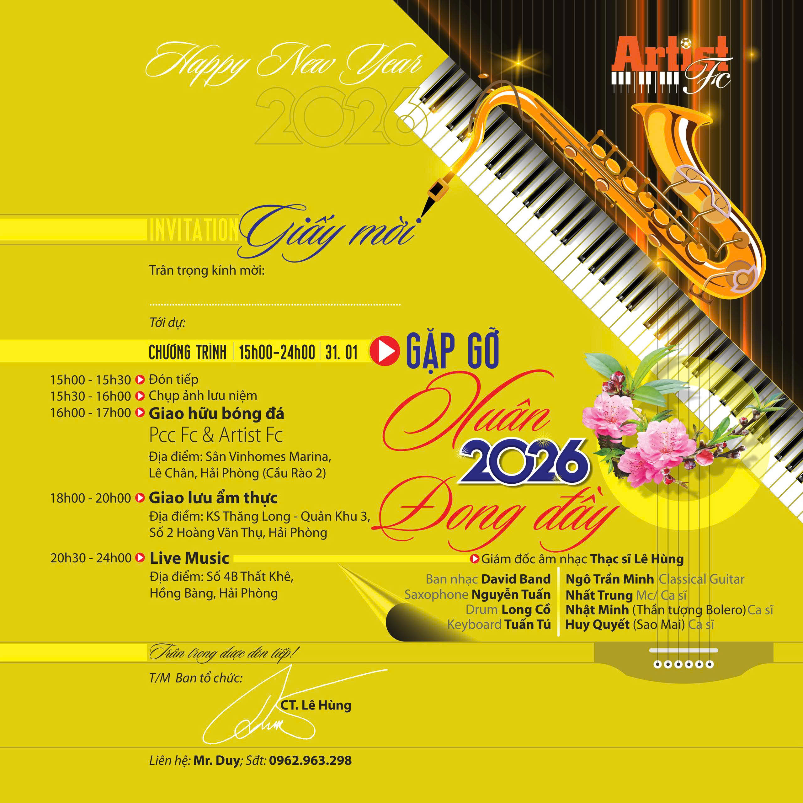 PCC fC – Thăng Long, 23/1/2026, trong không khí rộn ràng của những ngày cuối năm, khi thể thao và âm nhạc cùng hòa nhịp mở đầu cho một hành trình mới, PCC fC chuẩn bị lên đường đến thành phố Cảng Hải Phòng để tham dự chương trình giao lưu hữu nghị đặc biệt vào ngày 31/01/2026. Không chỉ là một trận bóng đá, đây là cuộc gặp gỡ của những con người chung một tinh thần Khỏe Vui Hạnh phúc, nơi sân cỏ, ẩm thực và âm nhạc kết nối thành một không gian sẻ chia, sáng tạo và lan tỏa năng lượng tích cực cho tất cả. Được biết, chương trình được sắp xếp tươi tốt đẹp bởi Tổng đạo diễn Nghệ sĩ Pianist Lê Hùng và MC Nhất Trung đảm nhiệm dẫn dắt toàn bộ sự kiện cùng dàn sao đắt giá.