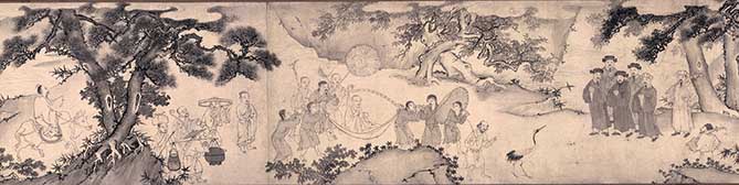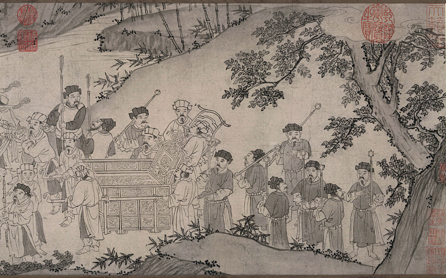 Một trích đoạn bức tranh Trúc Lâm đại sĩ xuất sơn chi đồ – Phật hoàng Trần Nhân Tông ngồi trên võng, vua Trần Anh Tông cùng quần thần đứng đón.