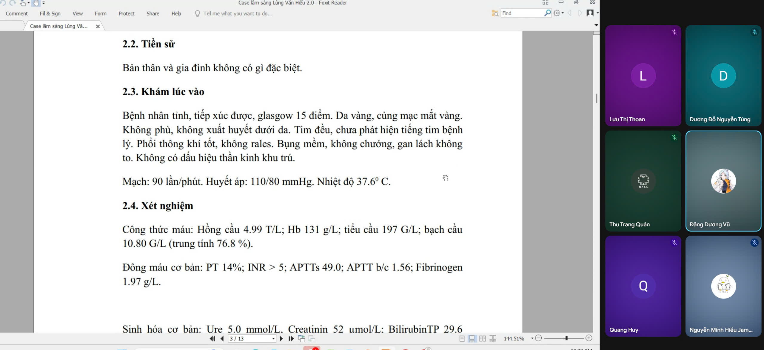 Ca lâm sàng thứ hai là rắn cạp nia cắn, suy gan cấp có áp dụng thay huyết tương, do sinh viên Quang Huy trình bày. Bệnh nhân biểu hiện tam chứng liệt cơ – giãn đồng tử – hạ natri máu, lại kết hợp thêm tổn thương gan, được điều trị đa mô thức, trong đó có thay huyết tương. Phiên thảo luận nhấn mạnh yêu cầu xác chẩn chẩn đoán dựa vào bệnh sử, biểu hiện lâm sàng và xét nghiệm độc tố/nhận diện rắn; đồng thời làm rõ tính mới của ca bệnh và bổ sung các chẩn đoán còn thiếu như tổn thương gan, suy gan để hoàn chỉnh hồ sơ khoa học.