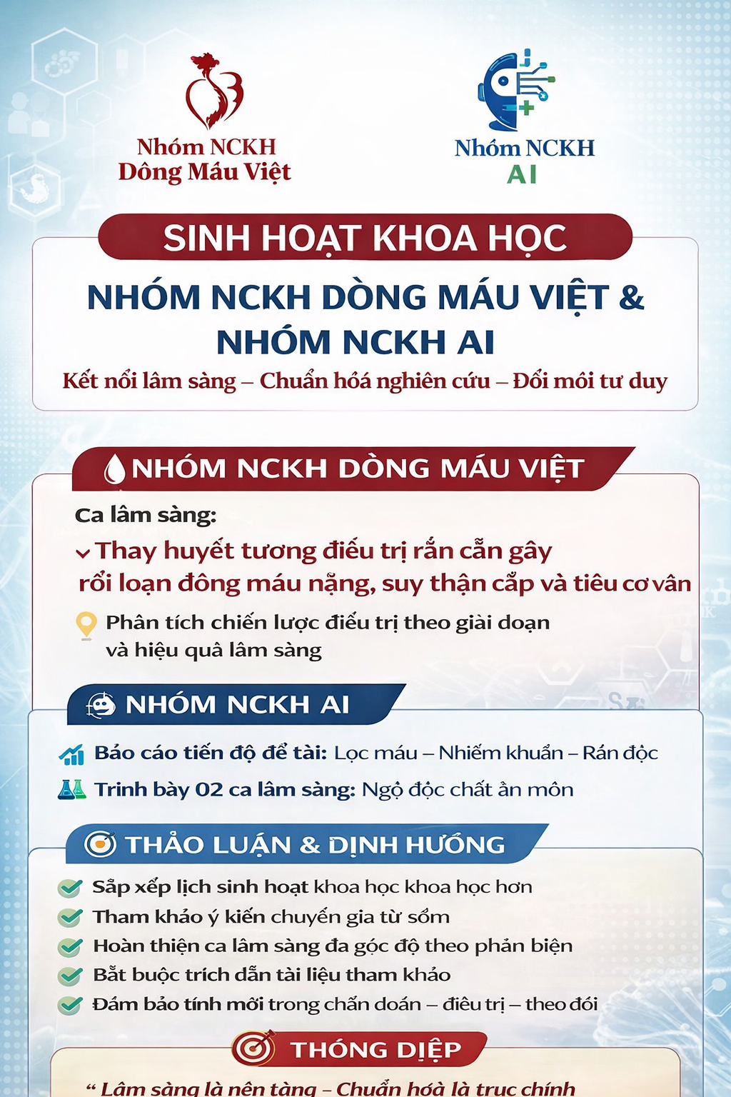 PCC Sci – Ngày 26/12/2025, Hôm nay, buổi sinh hoạt khoa học định kỳ của Nhóm NCKH Dòng Máu Việt và Nhóm NCKH AI đã diễn ra với nhiều nội dung chuyên môn thiết thực, tập trung vào các ca bệnh khó và định hướng nghiên cứu có tính ứng dụng cao trong thực hành lâm sàng. Tham dự họp online có bác sĩ nội trú trẻ Nguyễn Bá Minh Quang, thành viên CLB Bóng đá PCC fC và các thành viên của 2 CLB NCKH nêu trên.