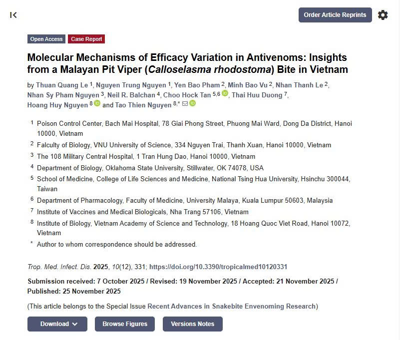 Bài báo có tiêu đề: “Molecular Mechanisms of Efficacy Variation in Antivenoms: Insights from a Malayan Pit Viper (Calloselasma rhodostoma) Bite in Vietnam”, tập trung làm rõ các cơ chế phân tử dẫn đến sự khác biệt về hiệu quả của huyết thanh kháng nọc rắn, dựa trên một ca lâm sàng rắn cắn được điều trị tại Việt Nam.