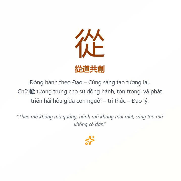 “從道而行” (Tòng Đạo Nhi Hành), hành động thuận Đạo – chính là nguyên tắc phát triển bền vững của mọi doanh nghiệp sáng tạo. Khởi nghiệp chân chính không phải là chống lại quy luật, mà là tìm thấy nhịp điệu riêng trong quy luật của thế giới. Đó là tinh thần “Tòng” – vừa linh hoạt, vừa kiên định, vừa sáng tạo, vừa tôn trọng tự nhiên của thị trường và con người.